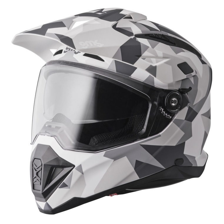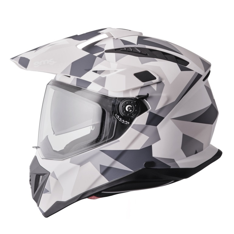 Casco All-Road Gms Adventus omologato ECE R22-06 bianco e grigio camo opaco, sun visor, interno sfoderabile, predisposizione interfono, predisposizione pinlock, sganci di emergenza, chiusura micrometrica