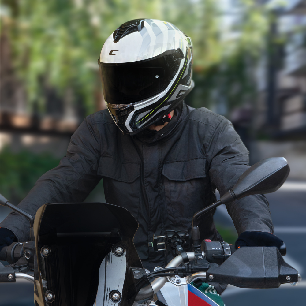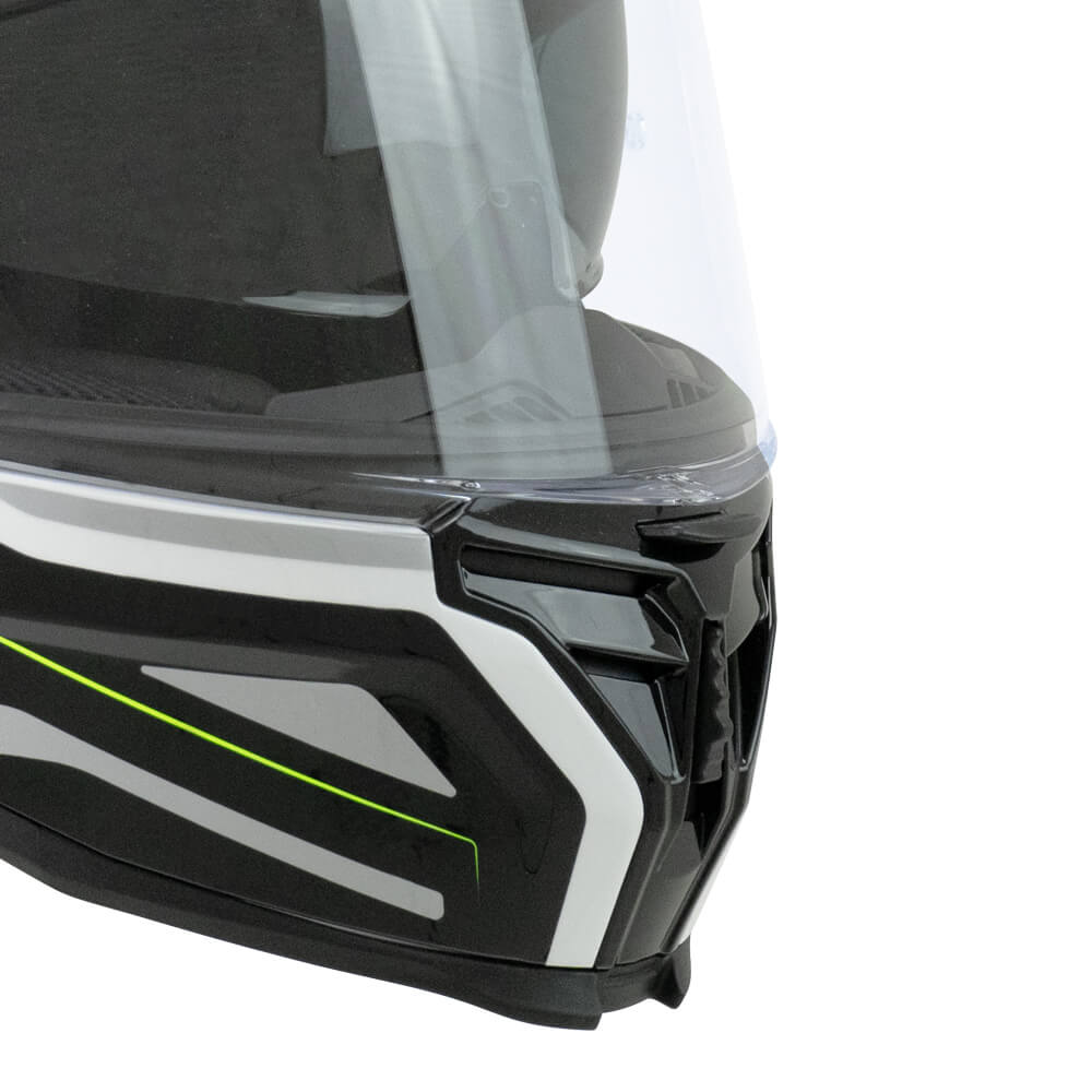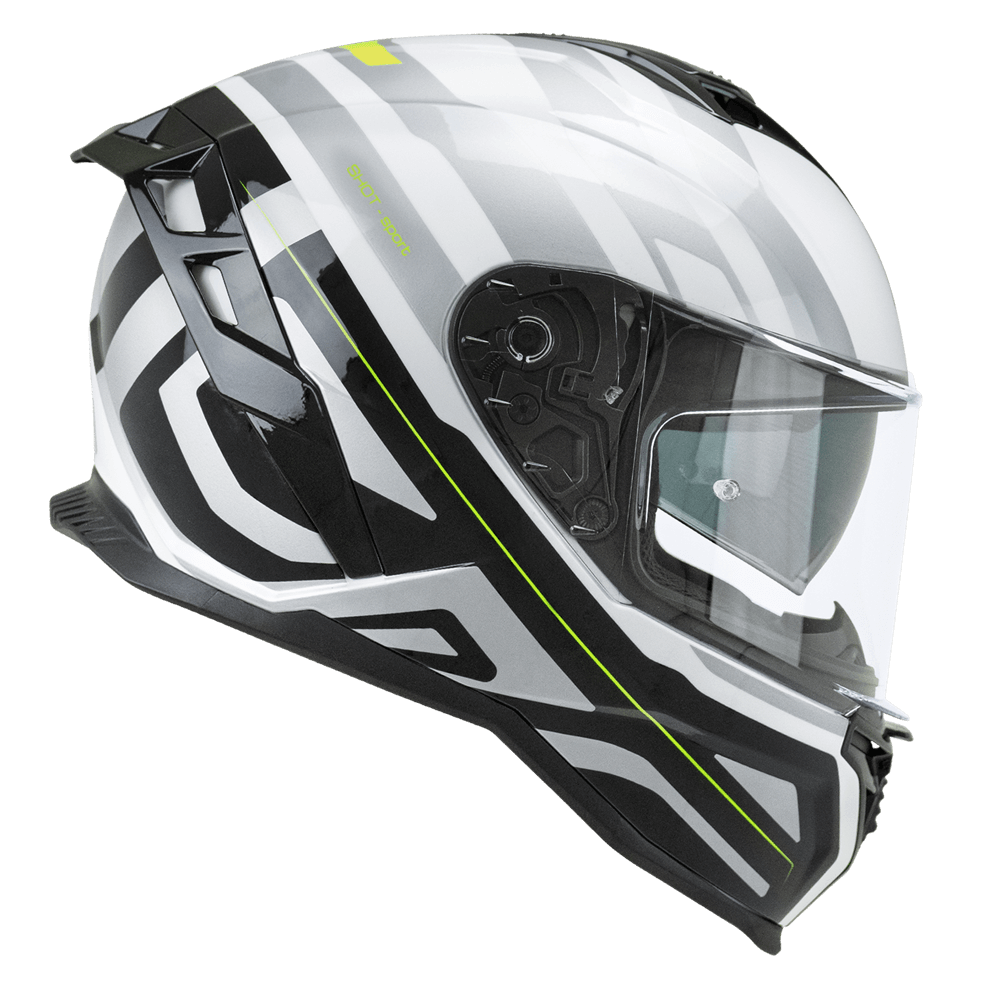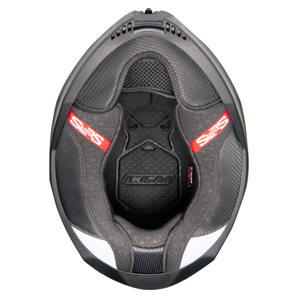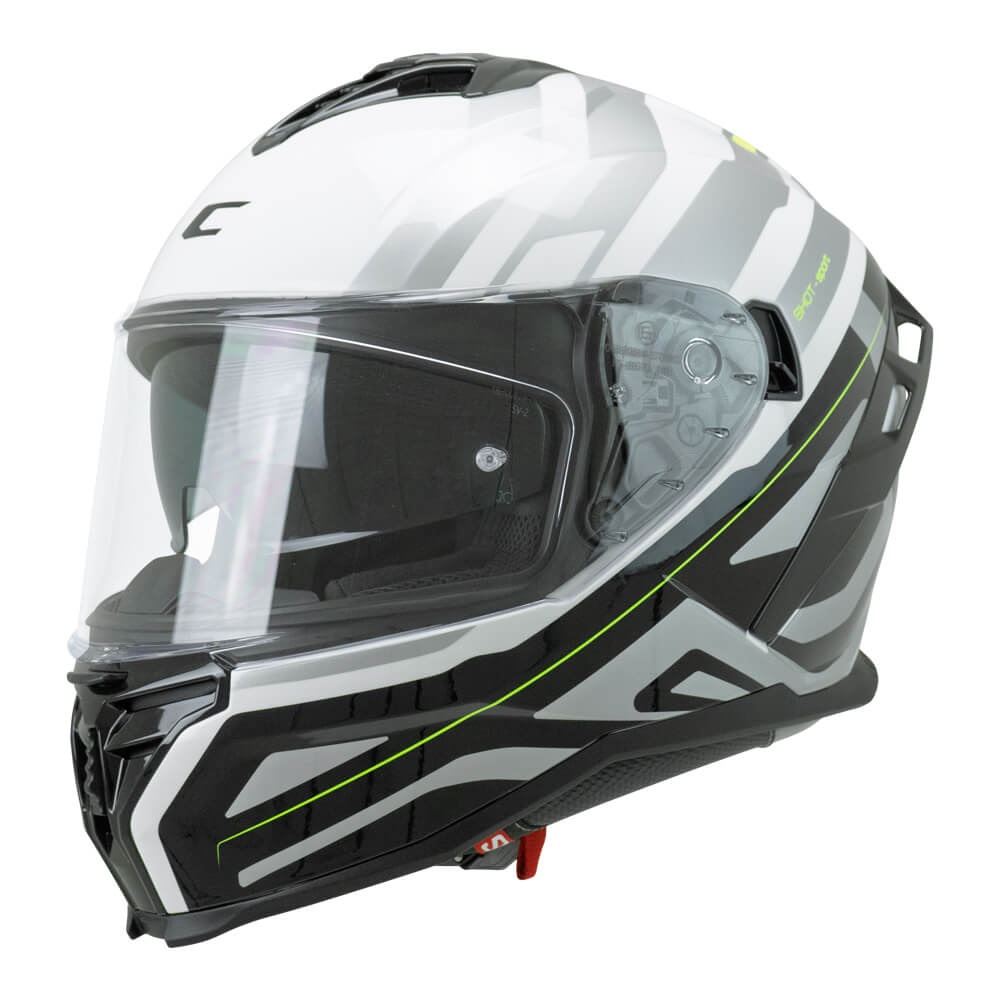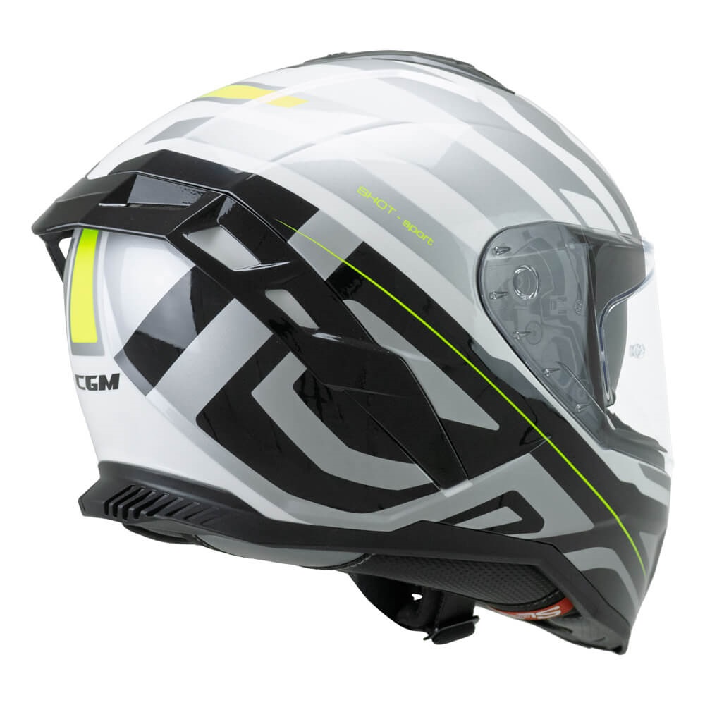 Casco integrale CGM Shot Sport omologato ECE R22-06 bianco, nero e giallo fluo, sun visor, interno sfoderabile, predisposizione interfono, predisposizione occhiali, sganci di emergenza, chiusura micrometrica